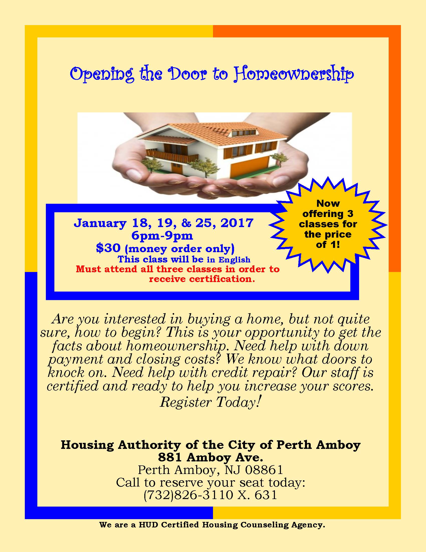 Homeownership Class Dates: January 18,19 & 25, 2017 (These classes will be in English)